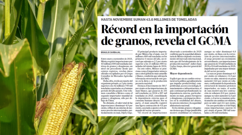 Entre enero y noviembre de 2025, México registró importaciones por 43 millones 600 mil toneladas métricas de granos y oleaginosas, el nivel más alto del que se tenga registro, de acuerdo con datos del Grupo Consultor de Mercados Agrícolas (GCMA).