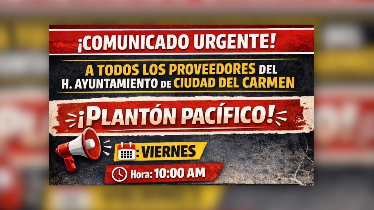 Circula en redes sociales la convocatoria de microempresarios y proveedores del Ayuntamiento de Ciudad del Carmen, quienes anunciaron un plantón pacífico para exigir el pago de adeudos por trabajos ya realizados y entregados en tiempo y forma. La manifestación está prevista para este viernes a las 10:00 de la mañana a las afueras del palacio municipal, donde buscan visibilizar la falta de cumplimiento en los pagos.