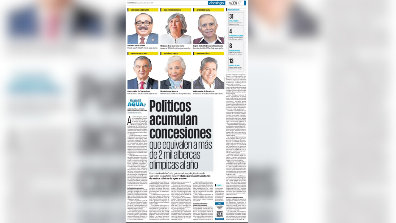 Anexa la imagen de la página periodística, cuyo título es: “Diputados acumulan concesiones que equivalen a más de 2 mil albercas olímpicas al año. Una ministra de la Corte, gobernadores y legisladores de casi todos los partidos, poseen títulos por más de 6 millones de metros cúbicos de agua anuales”.