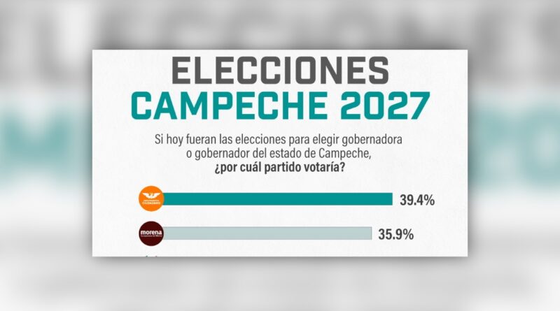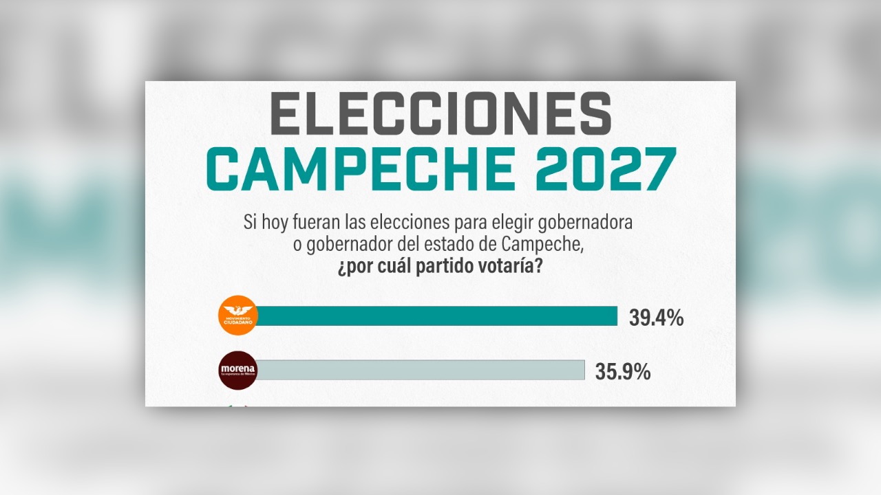 De acuerdo con un sondeo publicado ayer 13 de abril de 2026 por La Encuesta Mx, si hoy fueran las elecciones para elegir gobernador o gobernadora de Campeche ganaría Movimiento Ciudadano con el 39.4 por ciento, seguido de Morena con el 35.9 porcentual. Quedan atrás el PRI con 9.5% y el PAN con 4.2.
