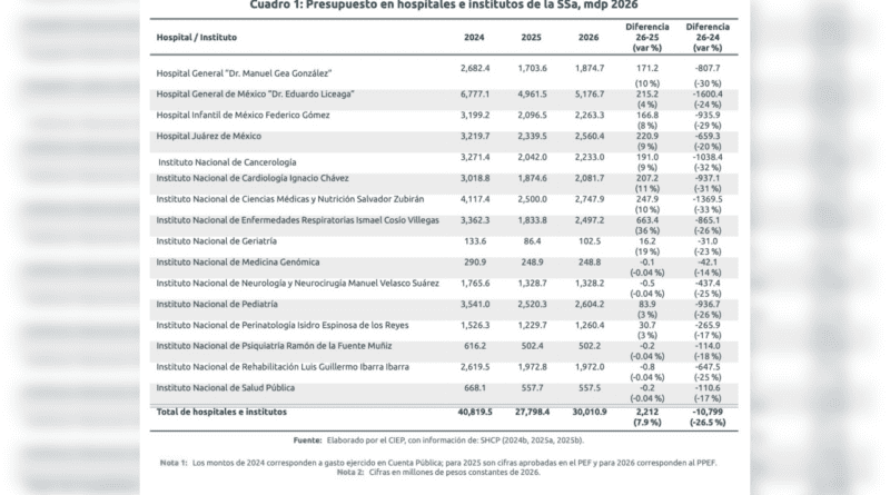 Y ejemplificó: el Hospital Infantil de México tendrá 935 millones menos que en 2024, es decir, un recorte del 29%; el Hospital General de México tendrá 1,600 millones menos (24%); el Instituto Nacional de Cardiología, 937 millones menos (31%), y el Instituto Nacional de Cancerología, 1,038 millones menos (32%).