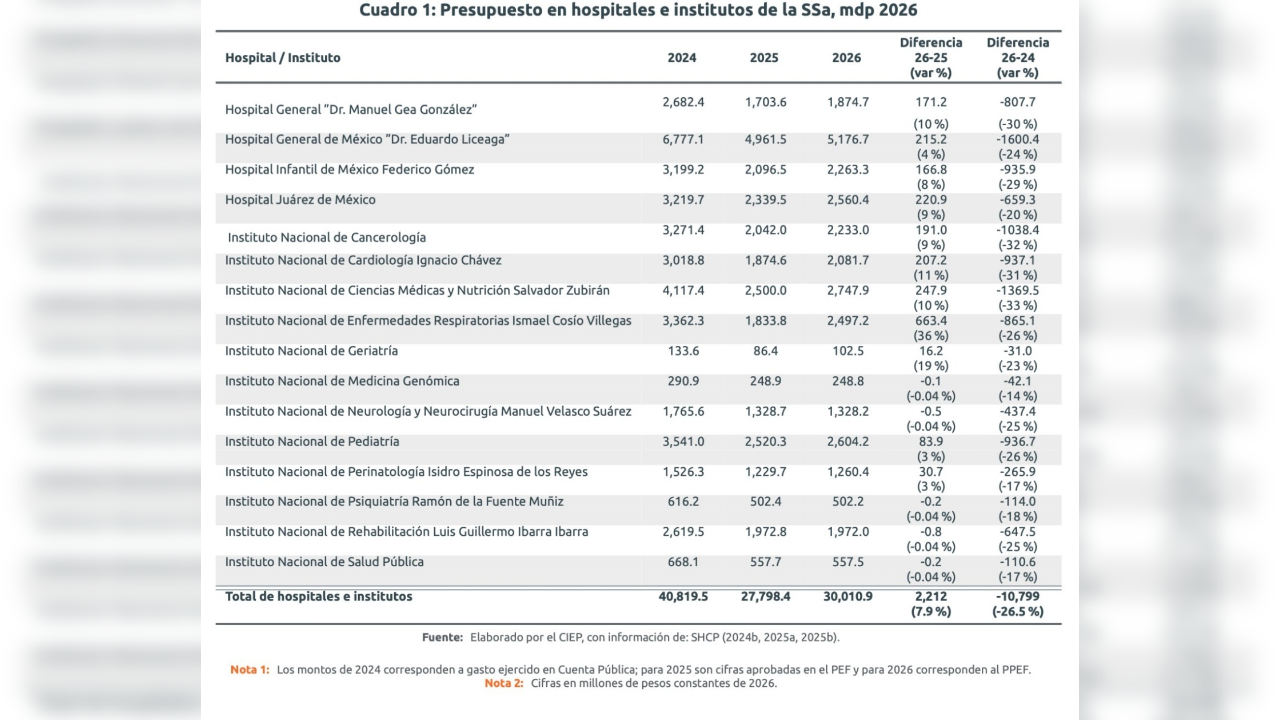 Y ejemplificó: el Hospital Infantil de México tendrá 935 millones menos que en 2024, es decir, un recorte del 29%; el Hospital General de México tendrá 1,600 millones menos (24%); el Instituto Nacional de Cardiología, 937 millones menos (31%), y el Instituto Nacional de Cancerología, 1,038 millones menos (32%).