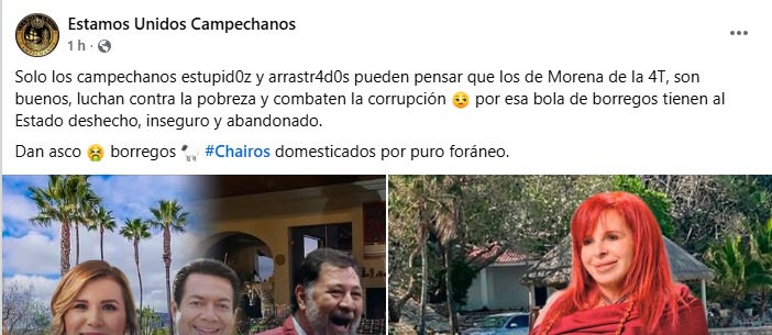 La publicación señala: “Sólo los campechanos 3stupid0z y arrastr4d0s pueden pensar que los de Morena de la 4T son buenos, luchan contra la pobreza y combaten la corrupción, por esa bola de borregos tienen al Estado deshecho, inseguro y abandonado. Dan asco borregos, chairos domesticados por puro foráneo”.