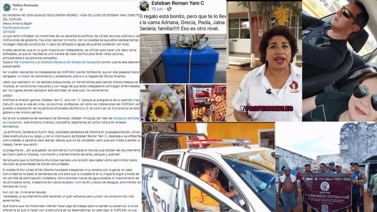 En una publicación en sus redes sociales, el periodista Marco Antonio Bazán denuncia que no Morena no son iguales, sino resultaron peores al incurrir en lo que tanto criticaron al usar recursos públicos e instituciones de Gobierno en labores de precampaña partidista, como ocurre con trabajadores del Instituto de Capacitación para el Trabajo del Estado de Campeche (Icatcam), cuyo director, Esteban Yam Cahuich, se da la vida de virrey.