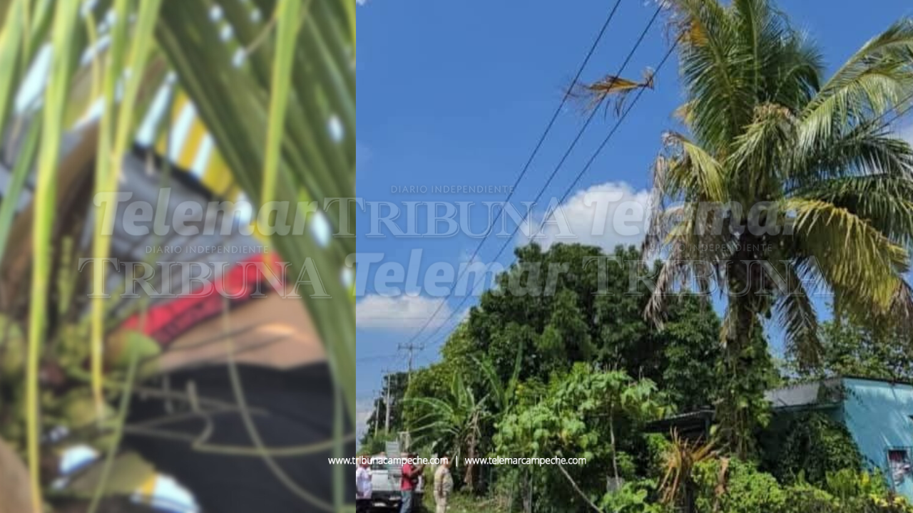 Escárcega.- Durante la mañana de hoy miércoles en la colonia Miguel Hidalgo de la cabecera de Escárcega, frente a la escuela, un varón perdió la vida de manera instantánea al recibir una descarga eléctrica cuando podaba una palmera, de la cual quedó colgado de los pies, para lo cual no contaba con el equipo ni preparación necesarios.