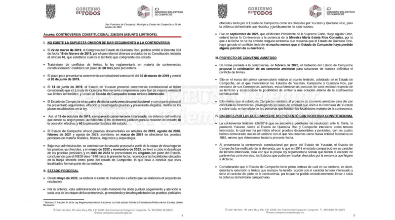 El Gobierno del Estado de Campeche, a través de su Consejería Jurídica, afirmó que aún no existe sentencia de que Quintana Roo haya ganado al lío limítrofe o que Campeche haya perdido su territorio.
