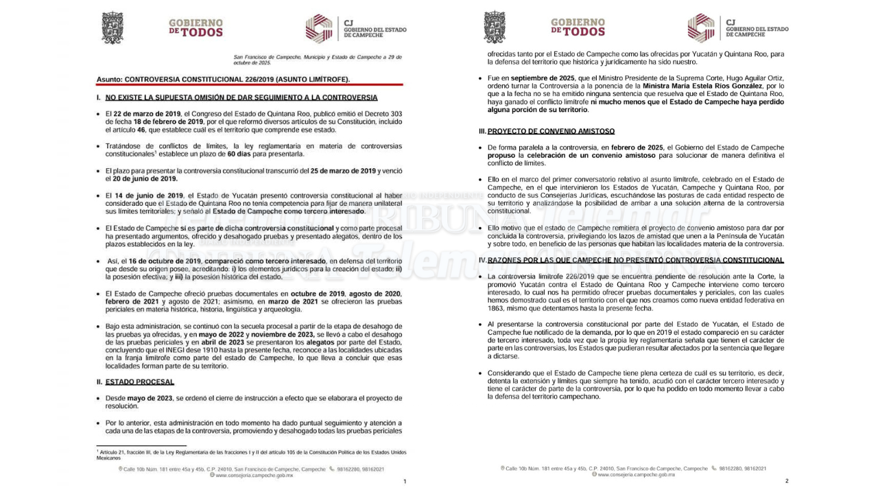 El Gobierno del Estado de Campeche, a través de su Consejería Jurídica, afirmó que aún no existe sentencia de que Quintana Roo haya ganado al lío limítrofe o que Campeche haya perdido su territorio.