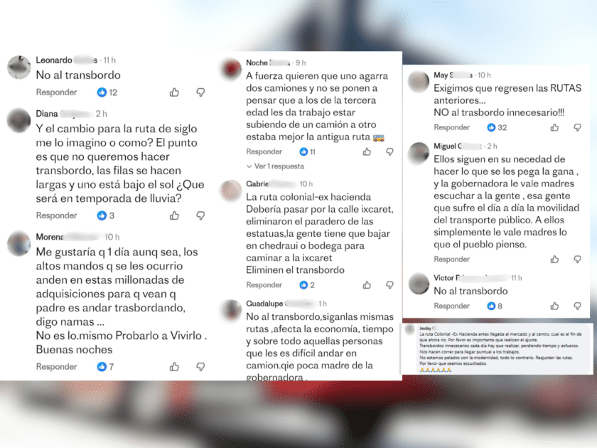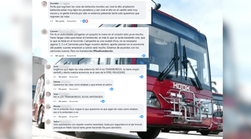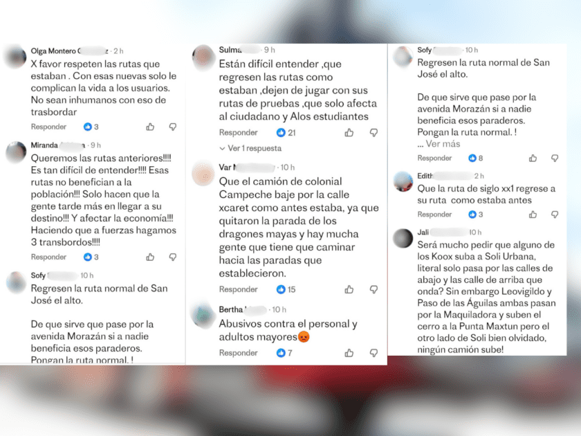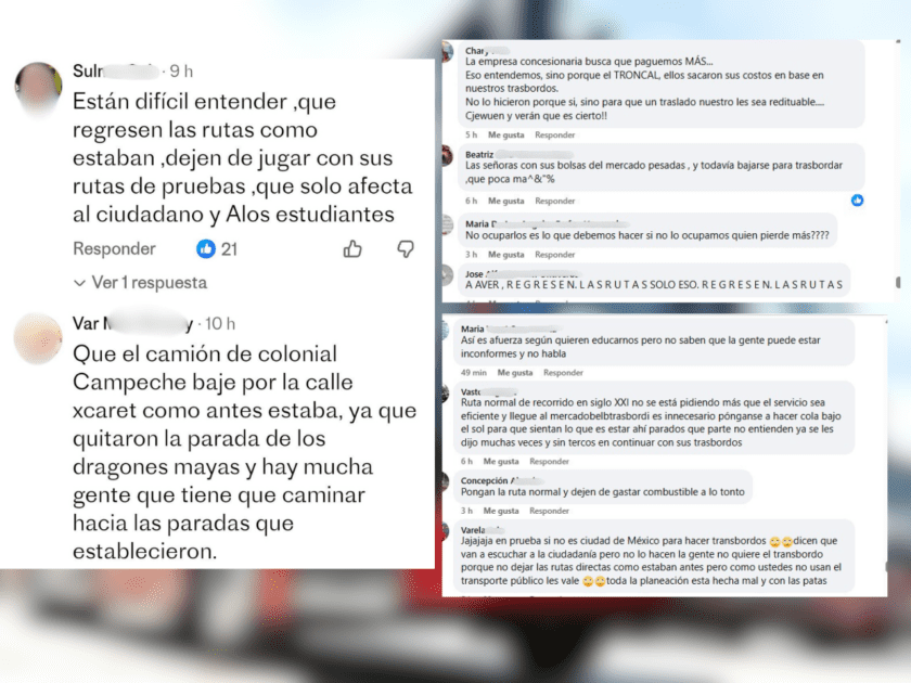El encono contra las autoridades se plasma en comentarios como: “A fuerza quieren que uno agarre dos camiones, y no se ponen a pensar que a los de la tercera edad les da trabajo estar subiendo de un camión a otro; estaba mejor la antigua ruta”, “La ruta Colonial Ex Hacienda debería pasar por la calle Xcaret, eliminaron el paradero de las estatuas, la gente tiene que bajar en Chedraui o bodega para caminar a la Xcaret. Eliminen el transbordo”, “No al transbordo, sigan las mismas rutas, afecta la economía, tiempo y sobre todo aquellas personas a las que les es difícil andar en camión; qué poca madre de la gobernadora”, y “Exigimos que regresen las rutas anteriores. No al transbordo innecesario”.