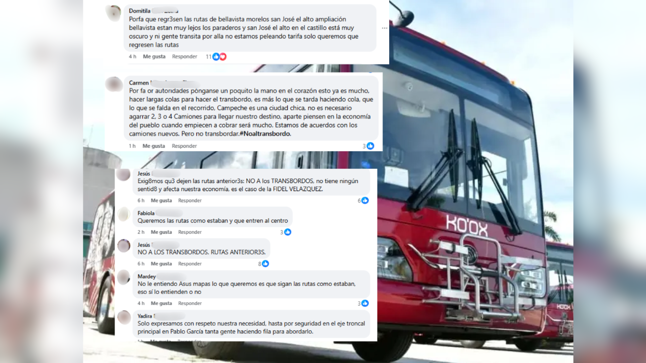 El encono contra las autoridades se plasma en comentarios como: “A fuerza quieren que uno agarre dos camiones, y no se ponen a pensar que a los de la tercera edad les da trabajo estar subiendo de un camión a otro; estaba mejor la antigua ruta”, “La ruta Colonial Ex Hacienda debería pasar por la calle Xcaret, eliminaron el paradero de las estatuas, la gente tiene que bajar en Chedraui o bodega para caminar a la Xcaret. Eliminen el transbordo”, “No al transbordo, sigan las mismas rutas, afecta la economía, tiempo y sobre todo aquellas personas a las que les es difícil andar en camión; qué poca madre de la gobernadora”, y “Exigimos que regresen las rutas anteriores. No al transbordo innecesario”.