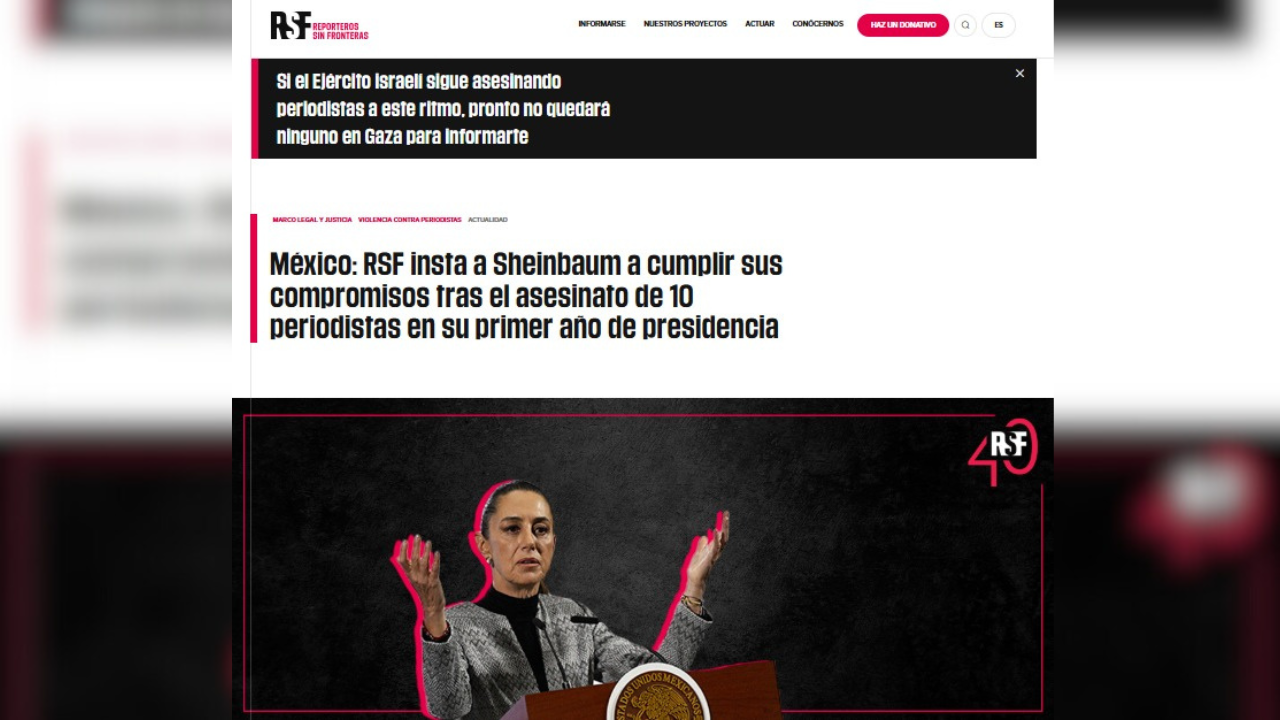 En la publicación, Reporteros Sin Fronteras recuerda que durante las elecciones presidenciales de 2024, la entonces candidata Claudia Sheinbaum firmó un compromiso elaborado por RSF para implementar cinco pilares estratégicos y 22 acciones concretas destinadas a enfrentar la violencia contra periodistas. Sin embargo, a 12 meses de su administración, ninguna de las medidas ha sido implementada en su totalidad y sólo tres han mostrado avances parciales.