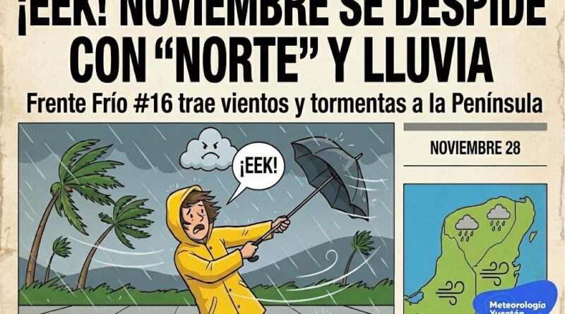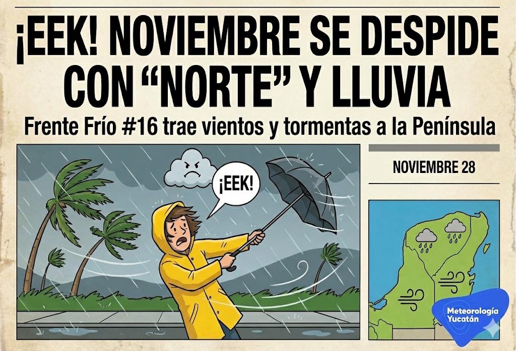 El mes de noviembre cerrará con un cambio marcado en las condiciones meteorológicas en la Península de Yucatán, debido a la aproximación del Frente Frío número 16, que generará lluvias, vientos fuertes y descenso de temperaturas en los próximos días.