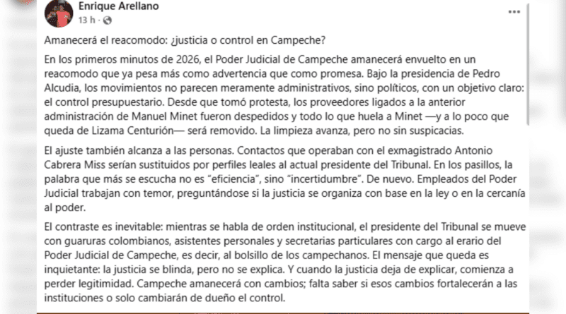 “Amanecerá el reacomodo: ¿justicia o control en Campeche? En los primeros minutos de 2026, el Poder Judicial de Campeche amanecerá envuelto en un reacomodo que ya pesa más como advertencia que como promesa. Bajo la presidencia de Pedro Alcudia, los movimientos no parecen meramente administrativos, sino políticos, con un objetivo claro: el control presupuestario. Desde que tomó protesta, los proveedores ligados a la anterior administración de Manuel Minet fueron despedidos y todo lo que huela a Minet —y a lo poco que queda de Lizama Centurión— será removido. La limpieza avanza, pero no sin suspicacias”.