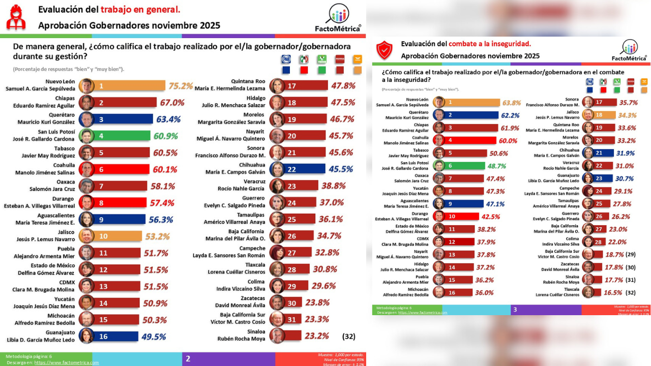 En aprobación en general le siguen Lorena Cuéllar, mandataria de Tlaxcala, 30.8%; Indira Vizcaíno, Colima (29.6%); David Monreal, Zacatecas (23.8); Víctor Castro, Baja California Sur (23.3), y Rubén Rocha, Sinaloa (23.2).