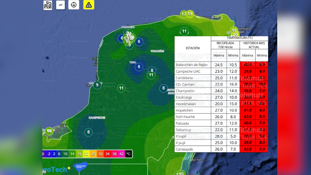 Otras estaciones de Campeche también presentaron temperaturas bajas en comparación con sus registros históricos, como Escárcega y Sabancuy con mínimas de 10 y 11 °C, cuando sus valores históricos del mes alcanzan mínimos de 5 °C, así como Candelaria con 11 °C frente a un histórico de 6.5 °C, y Hopelchén con 10 °C, cuyo mínimo histórico mensual es de 4 °C.