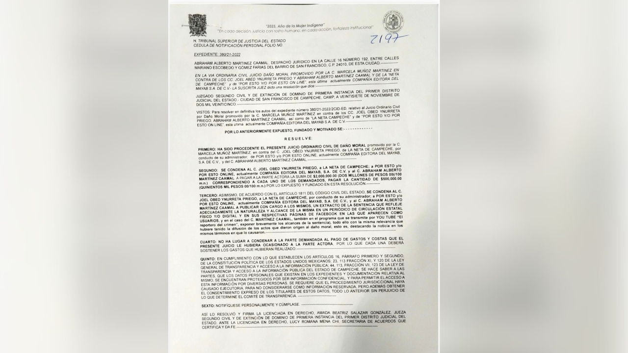 En un acto más de represión de la Administración estatal contra el periodismo crítico en el Estado de Campeche, la jueza segunda del ramo civil y de extinción de dominio de la primera instancia del Primer Distrito Judicial del Estado, Amada Beatriz Salazar González, consideró que los periodistas Joel Obet Ynurreta Priego, Abraham Alberto Martínez Caamal y los medios La Neta de Campeche, por conducto de su administrador, y Por Esto y/o Por Esto online, actualmente Compañía Editorial del Mayab, son responsables de daño moral contra la jefa policiaca Marcela Muñoz Martínez, por lo cual los sentenció a pagar 2 millones de pesos (500 mil pesos cada uno) como reparación.