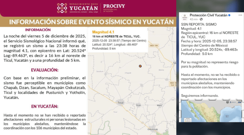 A las 23:38 horas de ayer viernes 5 de diciembre, se registró un sismo de magnitud 4.1 con epicentro en Ticul, dio a conocer Protección Civil de Yucatán y confirmaron el alcalde de ese Municipio, Humberto Parra Sosa, y el Servicio Sismológico Nacional (SSN).
