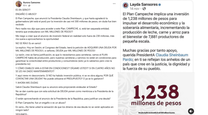 En una publicación en sus redes sociales, Aurora Sansores criticó que nadie dijo que por el Plan Campeche, cuya inversión es de mil 238 millones de pesos, anunciado por la presidenta Claudia Sheinbaum y agradecido por la gobernadora mediante un post, nuestra entidad tendría que endeudarse con mil millones de pesos, ante lo cual preguntó: “¿es engaño o abuso?”.