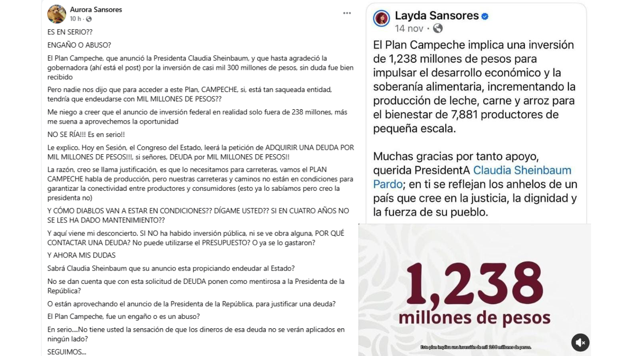 Sansores escribió: “El Plan Campeche que anunció la presidenta Claudia Sheinbaum, y que hasta agradeció la gobernadora (ahí está el post) por la inversión de casi mil 300 millones de pesos, sin duda fue bien recibido, pero nadie nos dijo que para acceder a este Plan, Campeche, si esta tan saqueada entidad, tendría que endeudarse con mil millones de pesos. Me niego a creer que el anuncio de inversión federal en realidad sólo fuera de 238 millones, más me suena a aprovechemos la oportunidad. No se ría!!! Es en serio!! Le explico”.