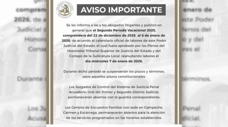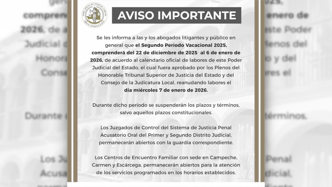 El Poder Judicial del Estado de Campeche informó a las y los abogados litigantes, así como al público en general, que el Segundo Periodo Vacacional 2025 comprenderá del 22 de diciembre de 2025 al 6 de enero de 2026, conforme al calendario oficial de labores aprobado por los Plenos del Honorable Tribunal Superior de Justicia del Estado y del Consejo de la Judicatura Local.
