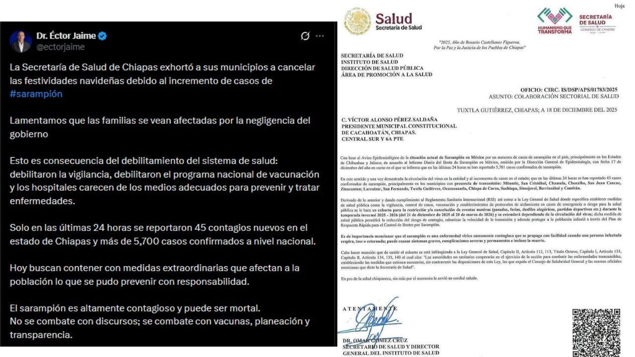 Debido a que sólo en las últimas 24 horas se reportaron 45 contagios nuevos de sarampión en el Estado, la Secretaría de Salud del Estado de Chiapas exhortó a sus Municipios a cancelar las festividades navideñas, con lo cual las familias se ven afectadas por negligencia del Gobierno, que debilitó al sistema de salud, la vigilancia y el programa nacional de vacunación, además de la falta de medios adecuados en los hospitales para prevenir y tratar enfermedades, denunció el doctor y diputado federal Éctor Jaime Ramírez Barba.