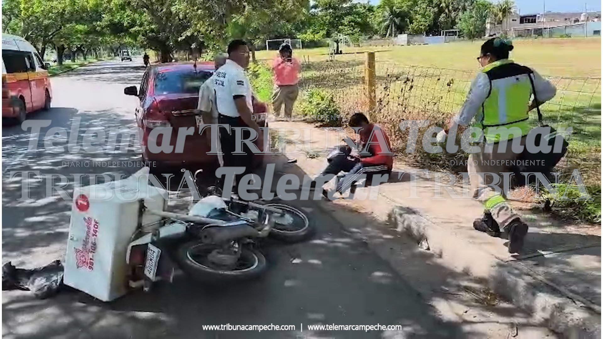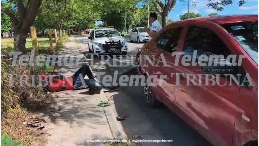 San Francisco de Campeche.- Con golpes en varias partes del cuerpo terminó el conductor de una motocicleta, luego de estrellarse contra la parte trasera de un vehículo rojo, cuando circulaba a exceso de velocidad sobre la avenida Concordia.