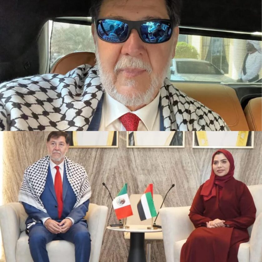 El legislador escribió: “Rumbo a mi primera reunión de la gira en Emiratos Árabes”. Acompañan a la publicación dos fotos, en una Noroña aparece con lentes oscuros dentro de un vehículo y en la otra en la reunión, junto a una mujer con vestimenta árabe.