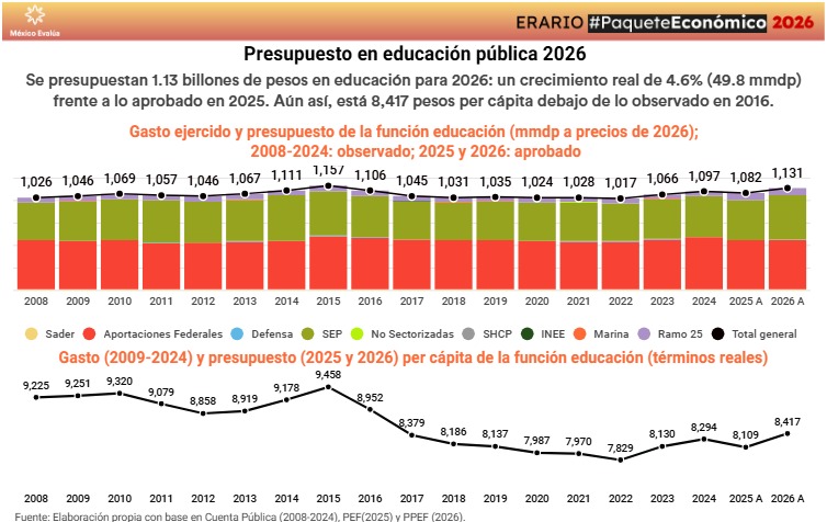 PRESUPUESTO FEDERAL 2026 PARA EDUCACIÓN ES 11% MENOR POR PERSONA AL APROBADO EN EL 2015: MÉXICO EVALÚA