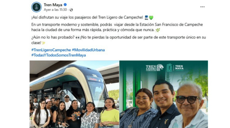 Campeche.- Ante la bajísima ocupación que registra el millonario proyecto del Tren Ligero, en un intento por “maquillar” esta realidad la organización gubernamental Tren Maya publicó en sus redes sociales un promocional presumiendo el “disfrute” de pasajeros, sin embargo, en las fotos aparecen empleados estatales como Carlos Lenin Rodríguez, director de Comunicación Social de la Secretaría de Inclusión, así como un empleado de la Unidad de Comunicación Social con uniforme y una mujer portando gafete de la Administración estatal.