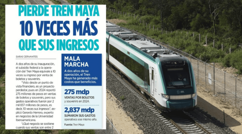 Al reportar que en el 2024 obtuvo 275 millones de pesos en ventas de boletos y souvenirs pero sus gastos operativos fueron por 2 mil 837 millones de pesos, el Tren Maya se erige como un proyecto perdedor, ya que pierde 10 veces más que sus ingresos.
