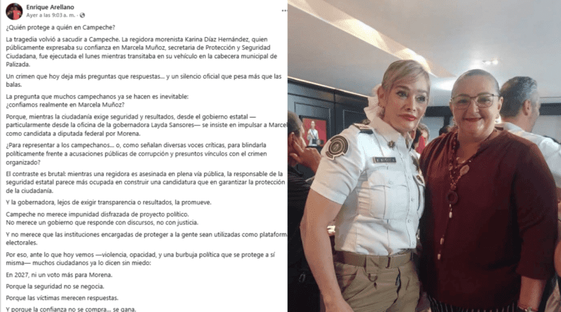 En una publicación en sus redes sociales, el analista político Enrique Arellano planteó: “¿Quién protege a quién en Campeche?, pues ante el asesinato de la regidora morenista de Palizada, Karina Díaz, hay silencio oficial y desde el Gobierno Estatal, concretamente desde la oficina de la gobernadora, se insiste en impulsar a Marcela como candidata a diputada federal guinda, “para representar a los campechanos o, como señalan diversas voces críticas, para blindarla políticamente frente a acusaciones públicas de corrupción y presuntos vínculos con el crimen organizado”.