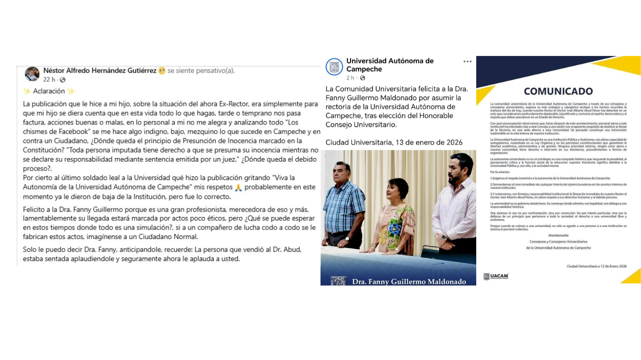 Mediante una publicación difundida en sus redes sociales, el creador digital Néstor Alfredo Hernández Gutiérrez cuestionó la falta del debido proceso contra José “A”, y al subrayar que la llegada de Fanny Guillermo Maldonado estará marcada por actos poco éticos, advirtió a la nueva rectora: “La persona que vendió al Dr. Abud estaba sentada aplaudiéndole, y seguramente ahora le aplauda a usted”.