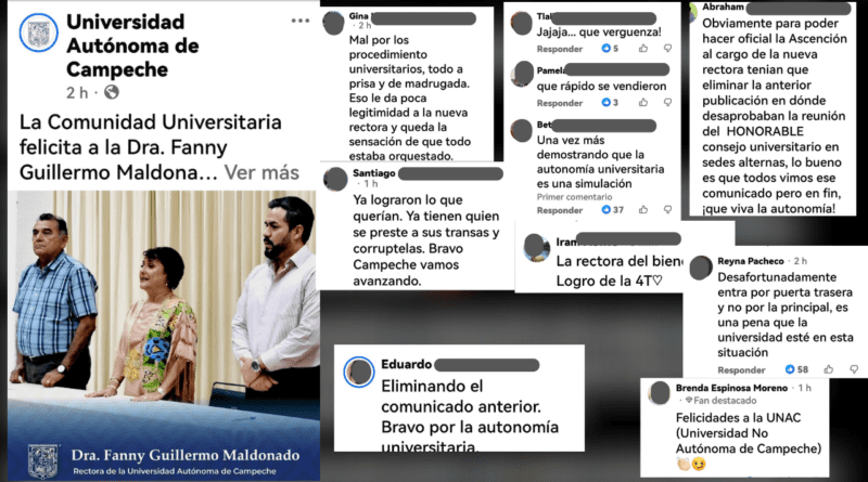 “Jajaja…qué vergüenza!”, “Qué rápido se vendieron”, “Una vez más demostrando que la autonomía universitaria es una simulación”, “Ya lograron lo que querían. Ya tienen quien se preste a sus transas y corruptelas. Bravo Campeche, vamos avanzando”, “Mal por los procedimientos universitarios, toda a prisa y de madrugada. Eso le da poca legitimidad a la nueva rectora y queda la sensación de que todo estaba orquestado”, y “La rectora del bienestar, logro de la 4T”, son algunas respuestas de cibernautas a la felicitación a la nueva rectora Fanny Guillermo Maldonado, en la página oficial de la Universidad Autónoma de Campeche (UAC).