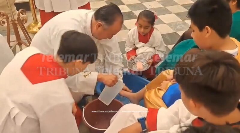 Con niños de catecismo caracterizados como los 12 apóstoles, el sacerdote Efraín Jiménez emuló el gesto de amor y humildad de Jesús al lavarle los pies durante la Última Cena.