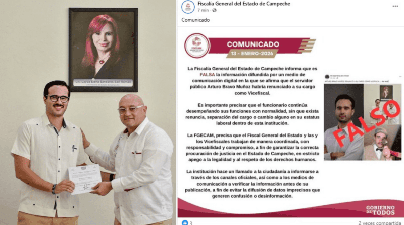 Al trascender, la FGECAM no tardó ni una hora para emitir comunicado donde confirma que el hijo de la jefa estatal policiaca Marcela Muñoz, sigue desempeñando sus funciones con normalidad, sin que exista renuncia, separación del cargo o cambio alguno en su estatus laboral dentro de la institución.