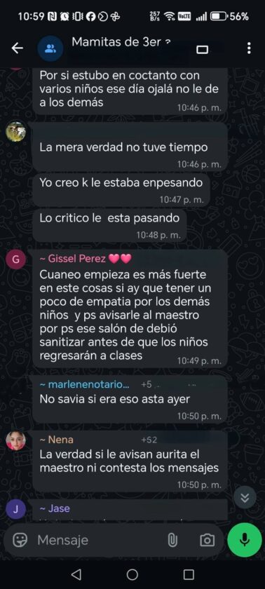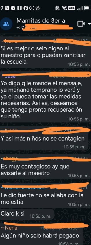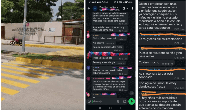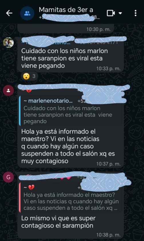 San Francisco de Campeche.- De acuerdo con conversaciones en un grupo de WhatsApp, una madre de familia de una primaria ubicada en la Fidel Velázquez reportó que su hijo tiene sarampión, ante lo cual otros papás le pidieron avisarle al maestro para tomar medidas preventivas, como suspender clases en su salón y sanitizar, pues temen que otros niños hayan sido contagiados.