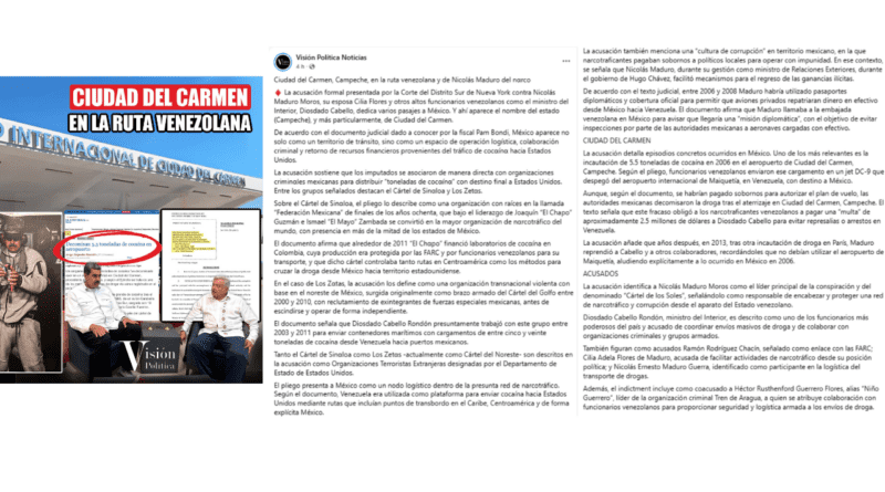 En la acusación formal que presentó la Corte del Distrito Sur de Nueva York contra Nicolás Maduro Moros, su esposa Cilia Flores y otros altos funcionarios venezolanos como el ministro del Interior, Diosdado Cabello, dedica varios pasajes a México, entre ellos el nombre del Estado (Campeche), particularmente el de Ciudad del Carmen, reportó la página Visión Política.