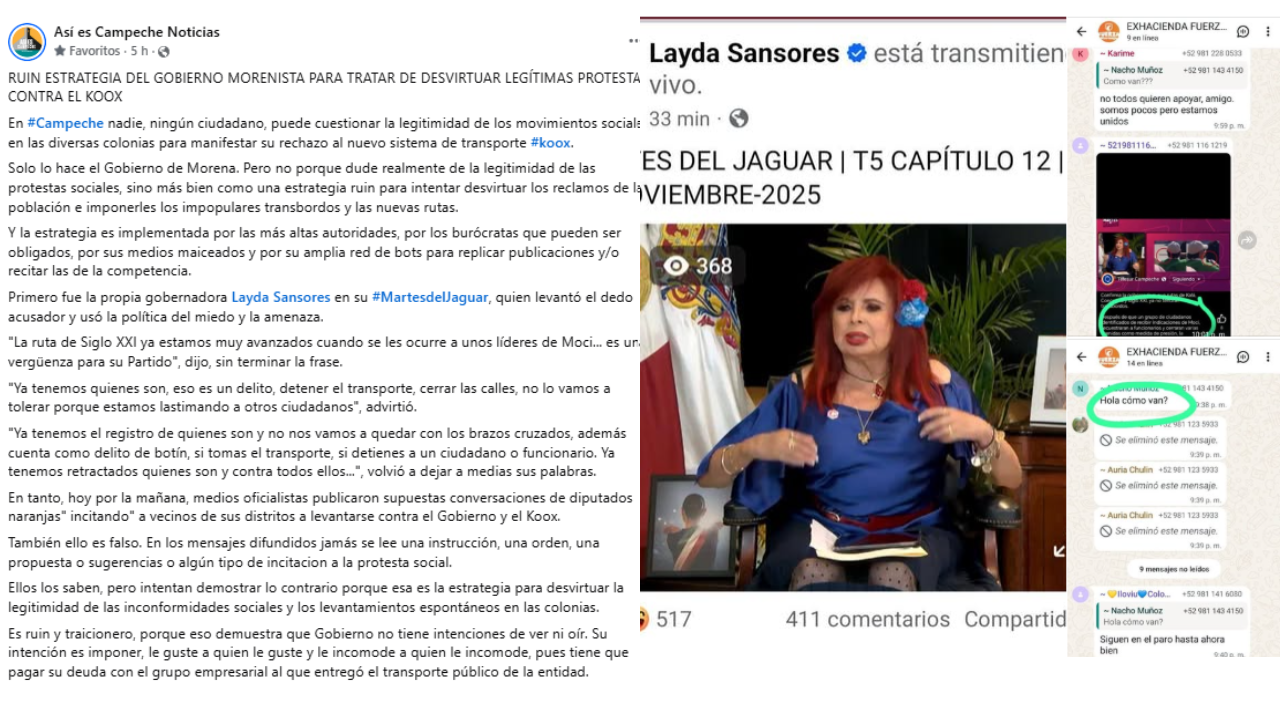 El escrito señala: “En Campeche nadie, ningún ciudadano, puede cuestionar la legitimidad de los movimientos sociales en las diversas colonias para manifestar su rechazo al nuevo sistema de transporte Ko’ox. Sólo lo hace el Gobierno de Morena. Pero no porque dude realmente de la legitimidad de las protestas sociales, sino más bien como una estrategia ruin para intentar desvirtuar los reclamos de la población e imponerles los impopulares transbordos y las nuevas rutas. Y la estrategia es implementada por las más altas autoridades, por los burócratas que pueden ser obligados, por sus medios maiceados y por su amplia red de bots para replicar publicaciones y/o recitar las de la competencia”.