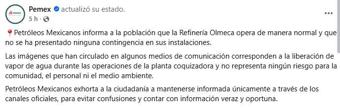 El texto señala: “Petróleos Mexicanos informa a la población que la Refinería Olmeca opera de manera normal y que no se ha presentado ninguna contingencia en sus instalaciones. Las imágenes que han circulado en algunos medios de comunicación corresponden a la liberación de vapor de agua durante las operaciones de la planta coquizadora y no representa ningún riesgo para la comunidad, personal ni medio ambiente”.