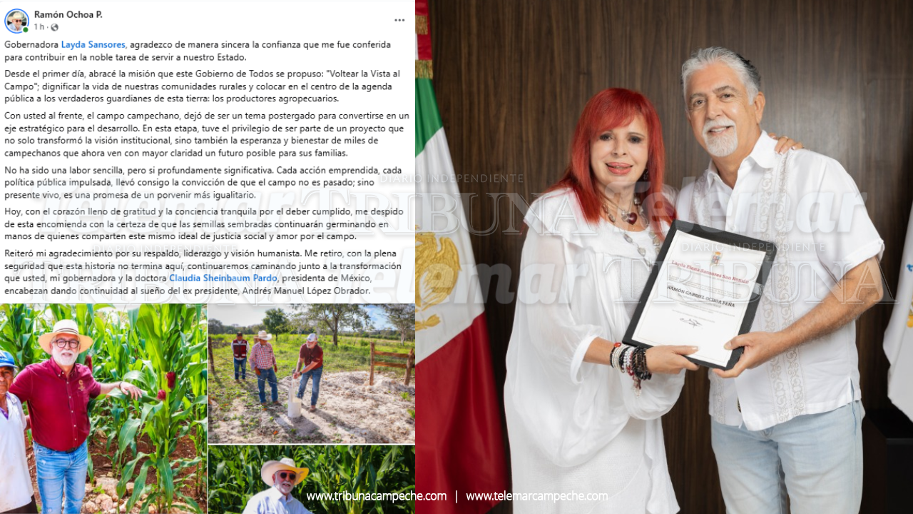 Ochoa Peña escribió: “Gobernadora Layda Sansores, agradezco de manera sincera la confianza que me fue conferida para contribuir en la noble tarea de servir a nuestro Estado”.