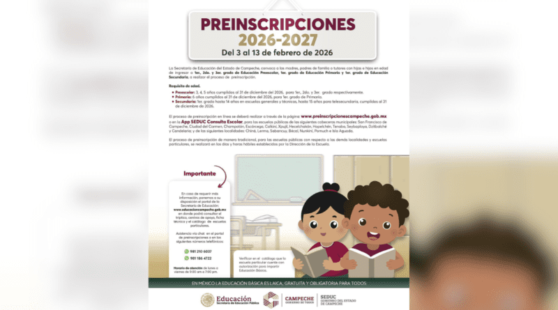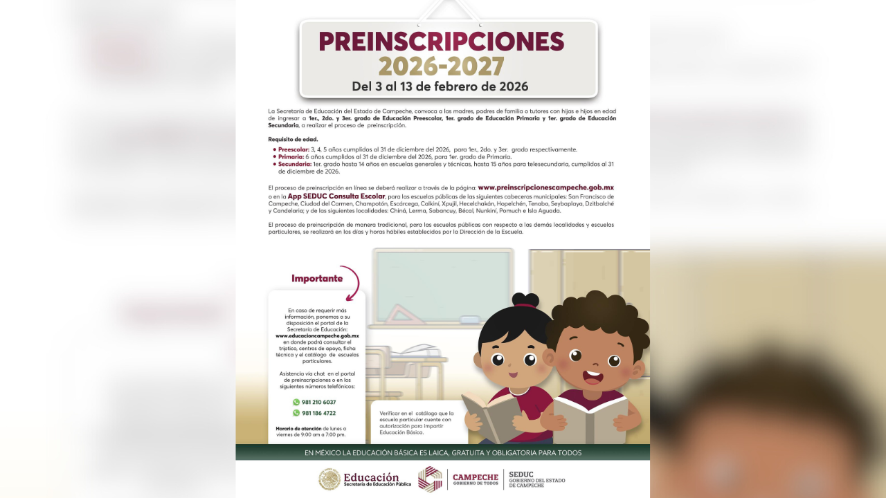 La Secretaría de Educación del Estado de Campeche informó que el proceso de preinscripciones 2026-2027 para educación básica se realizará del 3 al 13 de febrero de 2026.