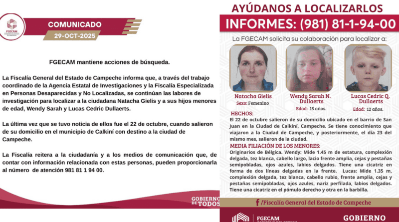 La Fiscalía General del Estado de Campeche (Fgecam) informó que continúa la búsqueda de una familia de origen belga que desapareció cuando se desplazaba de Calkiní hacia la capital del estado.