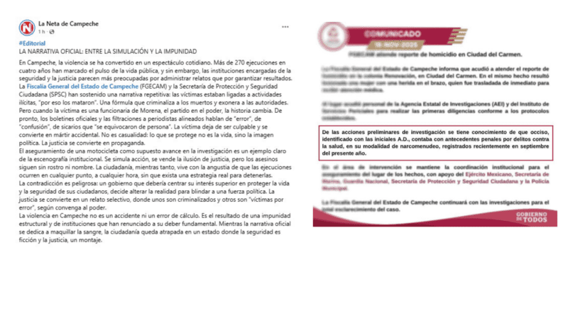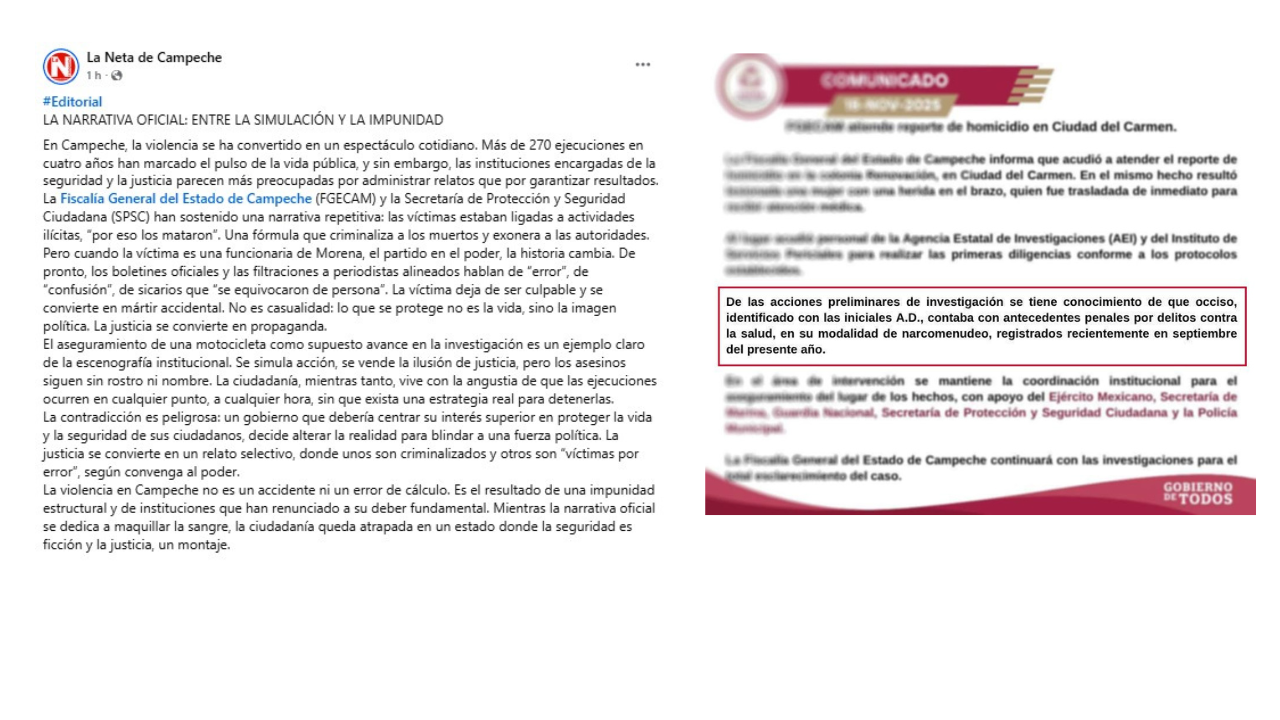 Y en medio del clima violento, tanto la Fiscalía General del Estado de Campeche como la Secretaría de Protección y Seguridad Ciudadana insisten en sostener la fórmula que criminaliza a los muertos y exonera a las autoridades. Las víctimas estaban ligadas a actividades ilícitas, por eso las mataron.