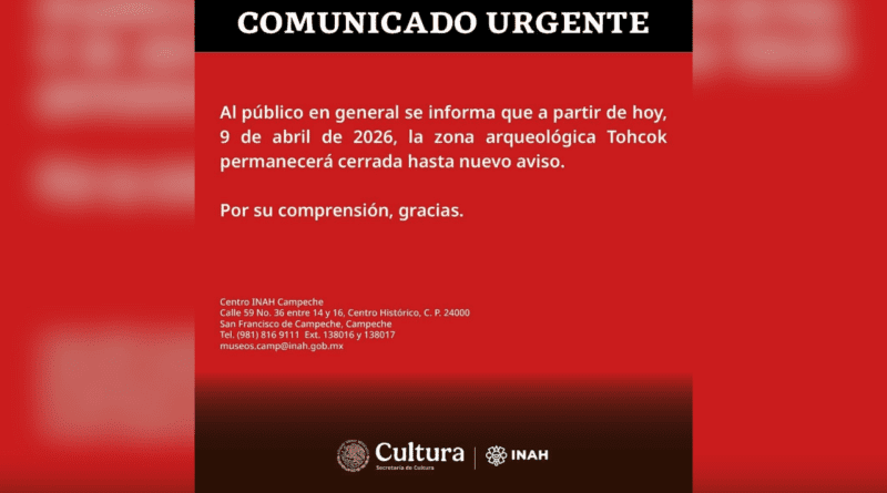 A través de un breve comunicado urgente en su sitio oficial, el Instituto Nacional de Antropología e Historia (INAH) anunció el cierre “hasta nuevo aviso” de la zona arqueológica de Tohcok, ubicada cerca del Municipio de Hopelchén, sin embargo, no aclaró el motivo.