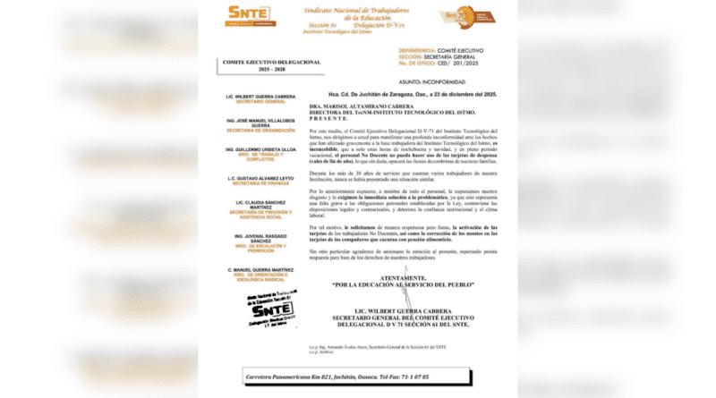 Lo anterior se puede constatar en un oficio enviado por el secretario general del Comité Ejecutivo Delegacional D-V-71, Sección 61 del Sindicato Nacional de los Trabajadores de la Educación (SNTE), Wilbert Guerra Cabrera, a la directora del TecNM-Instituto Tecnológico del Itsmo, Marisol Altamirano Cabrera, y calificaron como inconcebible este hecho por ocurrir a unas horas de la Nochebuena y Navidad y en plena temporada vacacional.