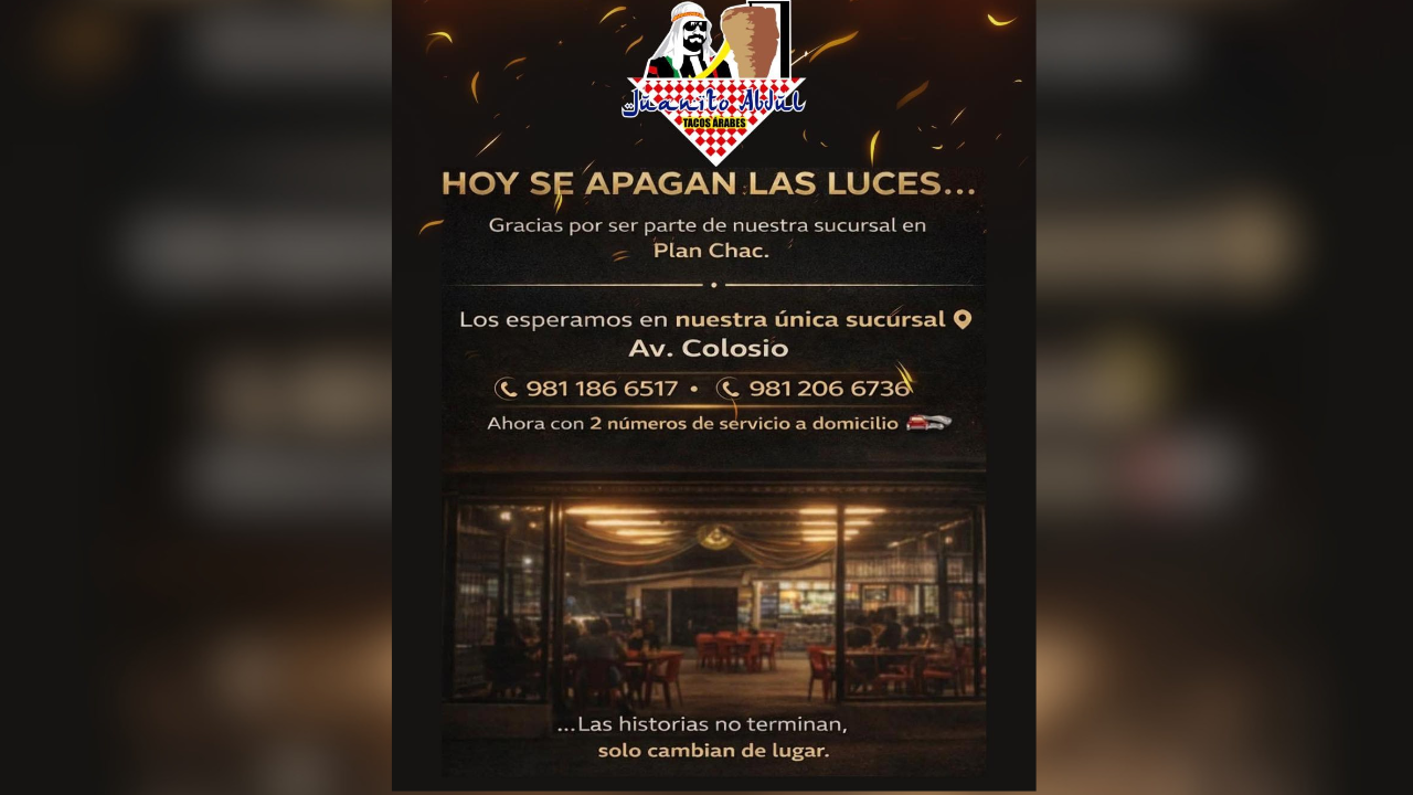 En sus redes sociales escribió: “Hoy no es un adiós… es un cambio de escenario. Después de tantos momentos, risas y tacos compartidos, nuestra sucursal de Plan Chac cierra sus puertas este 01 de abril es nuestro último día de operación. Gracias por cada visita, por cada recomendación y por ser parte de esta historia que se queda con nosotros”.