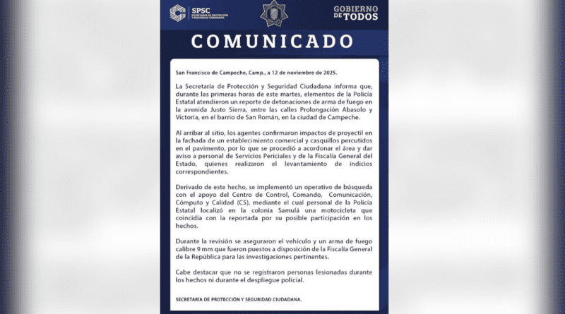 A través de un boletín, la Secretaría de Protección y Seguridad Ciudadana (SPSC) confirmó que en el malecón de la ciudad, concretamente en la avenida Justo Sierra, entre Prolongación Abasolo y Victoria del barrio de San Román, hubo disparos contra un establecimiento comercial, sin que se reportaran personas heridas, tras lo cual ubicaron y aseguraron en Samulá una motocicleta y un arma de fuego que habrían sido utilizadas en esos hechos.