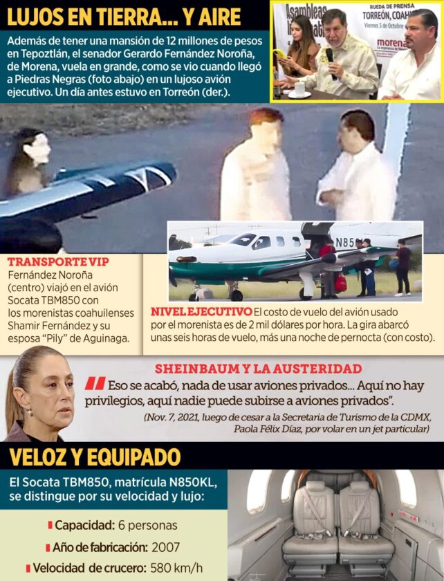 El senador Gerardo Fernández Noroña fue captado en fotos y video al abordar un avión privado de lujo a Coahuila para asistir a sus “asambleas informativas”, y de acuerdo con una investigación del Diario Reforma, viajó en un Socata TBM850, valuado en 2 mil dólares por hora.