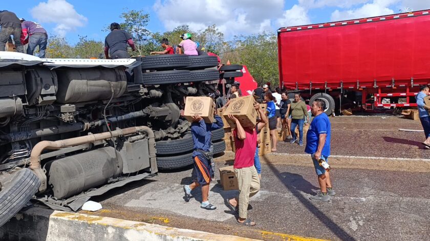 San Francisco de Campeche.- A disposición de la autoridad ministerial permanecen 5 personas que fueron aseguradas durante la rapiña al tráiler cargado de cervezas, el cual volcó la mañana de ayer martes 24 de febrero en la carretera federal Campeche-Mérida, a la altura del poblado de San Francisco Kobén.