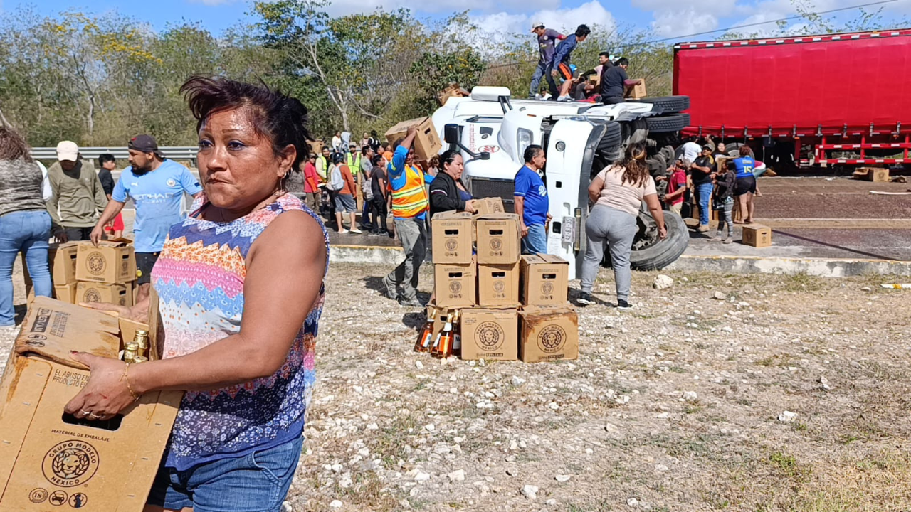 San Francisco de Campeche.- A disposición de la autoridad ministerial permanecen 5 personas que fueron aseguradas durante la rapiña al tráiler cargado de cervezas, el cual volcó la mañana de ayer martes 24 de febrero en la carretera federal Campeche-Mérida, a la altura del poblado de San Francisco Kobén.