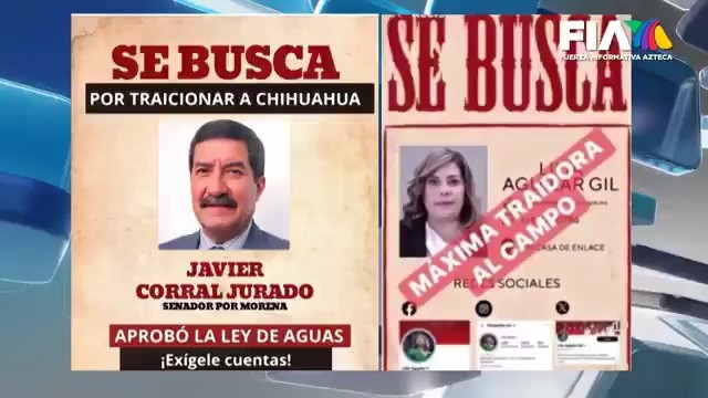 Al anunciar: “Se buscan por traidores al campo y a la patria”, un video difundido en sus redes sociales, Fuerza Informativa Azteca (FIA) dio a conocer que productores de Chihuahua tacharon de traidores al senador morenista Javier Corral y a la diputada petista Lilia Aguilar, por no defenderlos de la reforma a la Ley de Aguas.
